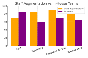 - Visual Element: Embed a bar chart comparing key metrics for staff augmentation vs. in-house teams (e.g., Cost Efficiency: 70% vs. 40%, Speed to Hire: 80% vs. 30%, Flexibility: 75% vs. 25%, Expertise Access: 65% vs. 35%).